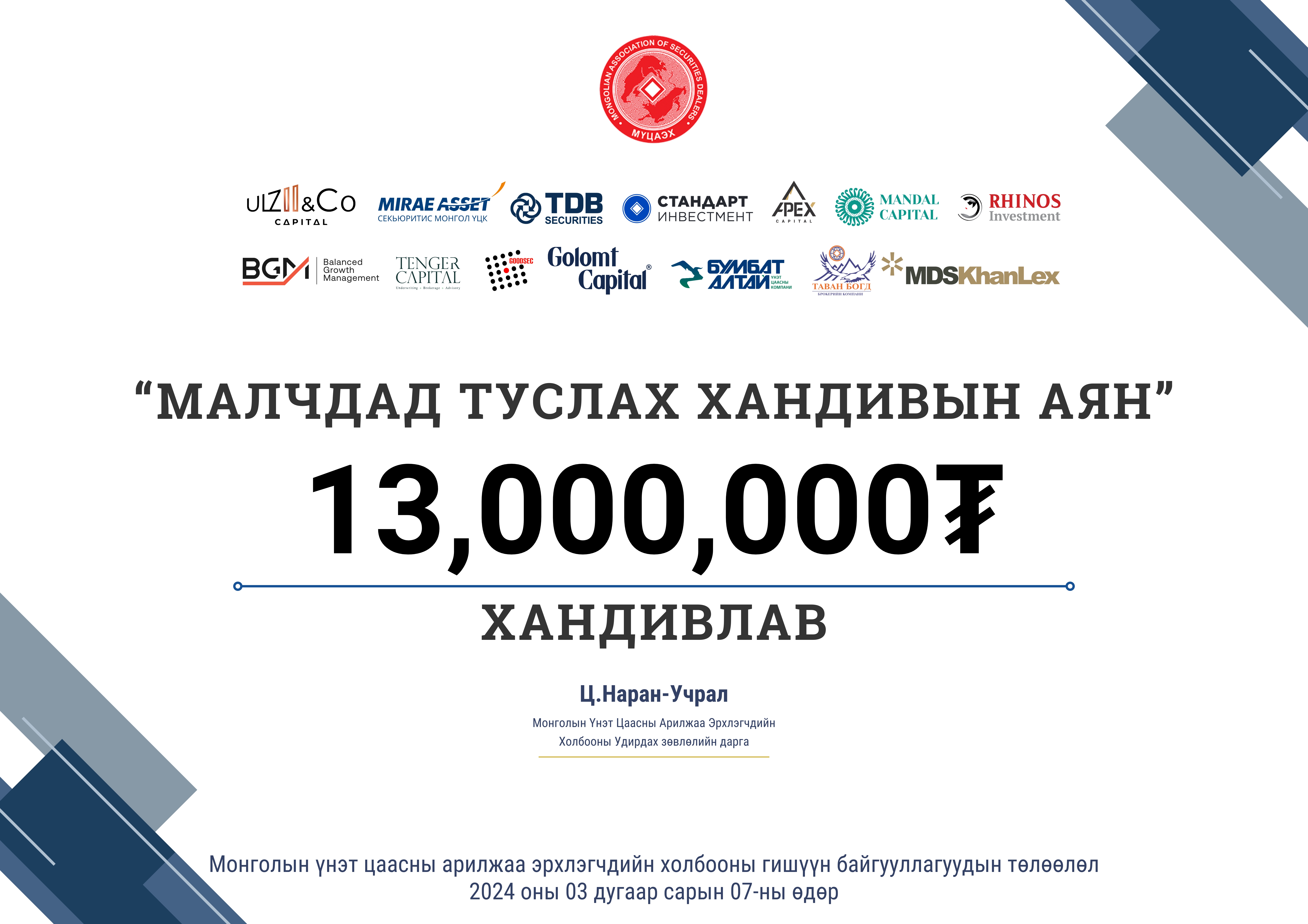 Монгол Улсын нийт нутгаар хаваржилтын нөхцөл нэн хүнд, байгаль цаг агаарын хүндхэн үе тохиож малчдын амьжиргаанд хүндрэл тулгарч байгаа цаг үед Монголын үнэт цаасны арилжаа эрхлэгчдийн холбооноос нийт гишүүн байгууллагууддаа "Малчдад туслах хандивын аян"-д нэгдэхийг уриалж Холбоо болон 14 гишүүн байгууллагаас мөнгөн хандив цугларсныг Улсын онцгой комисст хүлээлгэн өглөө.