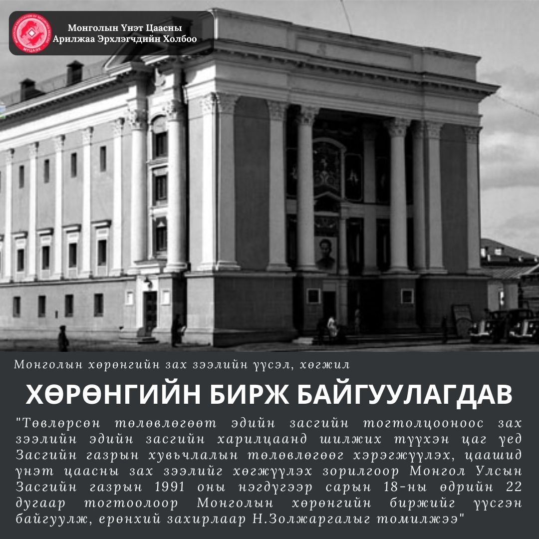 Төвлөрсөн төлөвлөгөөт эдийн засгийн тогтолцооноос зах зээлийн эдийн засгийн харилцаанд шилжих түүхэн цаг үед Засгийн газрын хувьчлалын төлөвлөгөөг хэрэгжүүлэх, цаашид үнэт цаасны зах зээлийг хөгжүүлэх зорилгоор Монгол Улсын Засгийн газрын 1991 оны нэгдүгээр сарын 18-ны өдрийн 22 дугаар тогтоолоор Монголын хөрөнгийн биржийг үүсгэн байгуулж, ерөнхий захирлаар Н.Золжаргалыг томилжээ.